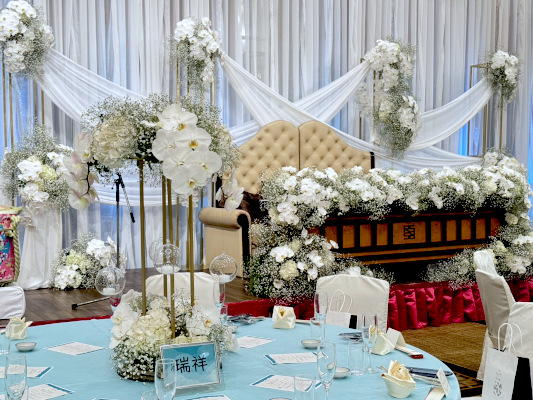 凛と咲く胡蝶蘭と、ふわりと包み込むかすみ草。 上品さとやわらかさが溶け合う、洗練されたウェディング装花に仕上がりました。 気品あふれる白のグラデーションが、おふたりの大切な一日を静かに、そして美しく彩ります。