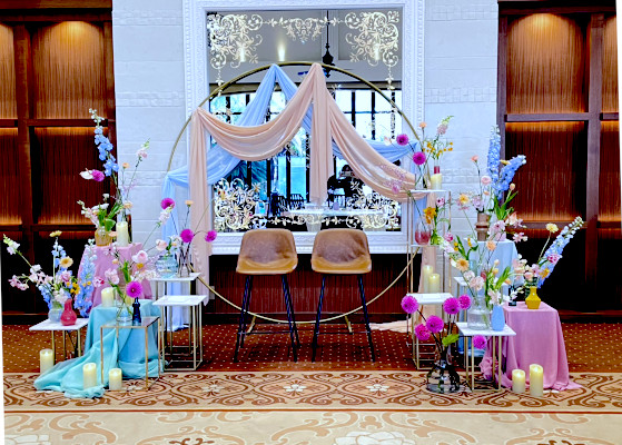 桜と竹を組み合わせ、高低差のある春の装飾に🌸 やわらかな桜と凛とした竹が、会場を一気に華やかな空間に彩りました。