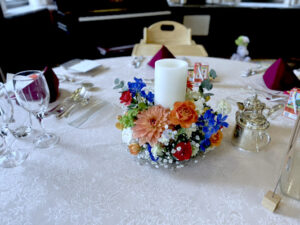 もうひとつはダリアを主役に、まるで色打ち掛けのような艶やかな卓上装花。